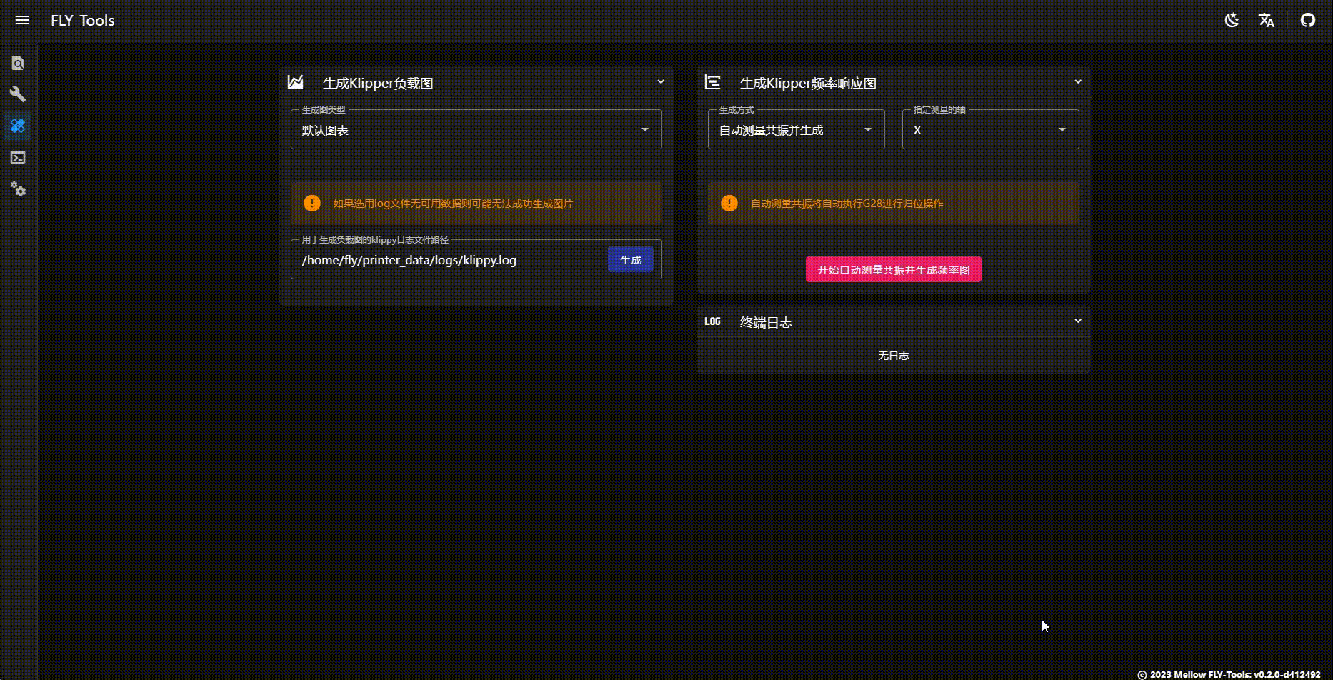 FlyOS-ArmbianFly-Tools生成负载图等功能演示 支持生成Klipper默认负载图 支持生成MCU频率图 支持生成系统负载图 支持生成温度曲线图 支持生成频率响应图,也可以送现有文件直接生成图表 如果提示缺少matplotlib需要执行下方指令 ~/klippy-env/bin/pip install -v matplotlibLoading...
