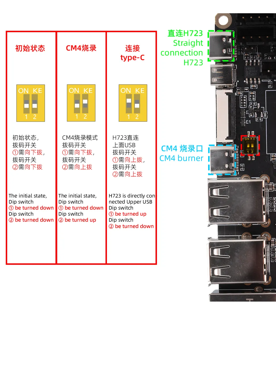 - 为了保证CM4供电正常,在使用Type C 接口烧录镜像时,请不要连接其他设备。