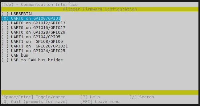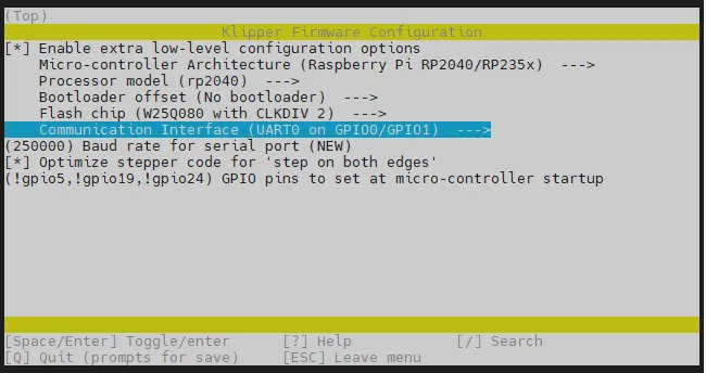 cd ~/klipper && rm -rf ~/klipper/.config && rm -rf ~/klipper/out && make menuconfig -