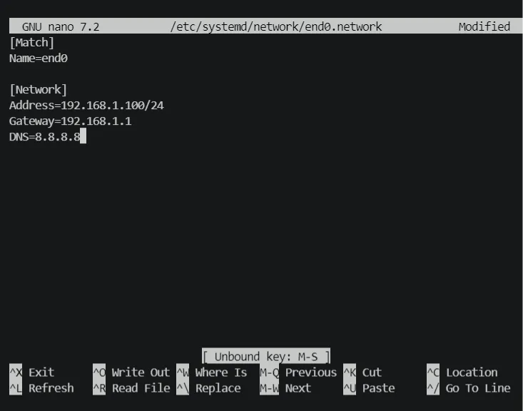 nano /etc/systemd/network/end0.network - Note: Replace