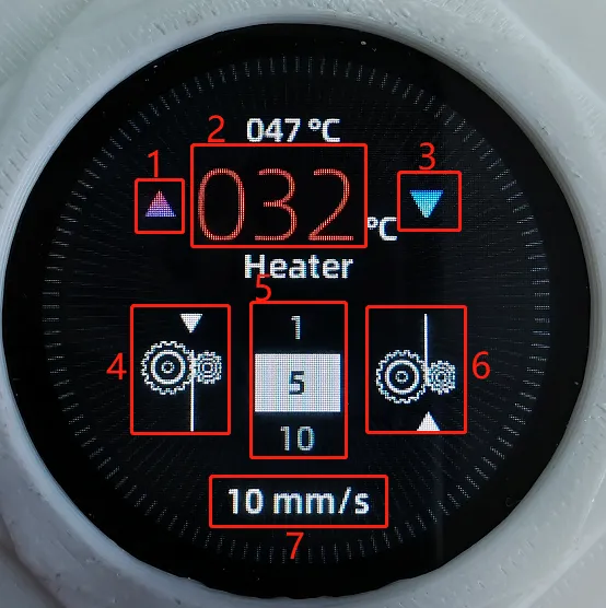 - Click: Enter the extrusion temperature setting, adjust the temperature by dragging the ring bar, and click the area 1 again to confirm the set temperature