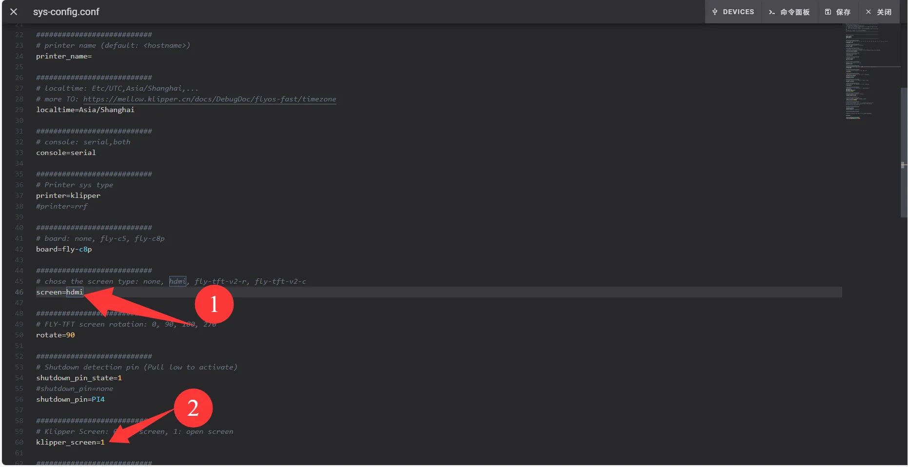 1. Edit the sys-config.conf file. This file is a symbolic link to the config.txt file in the removable disk FlyOS-Conf.