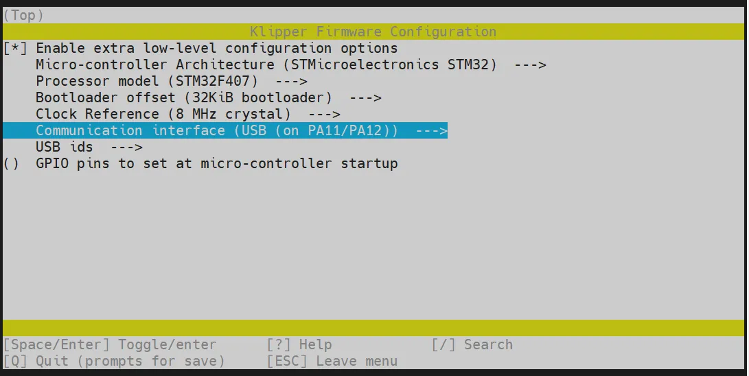 cd ~/klipper && rm -rf ~/klipper/.config && rm -rf ~/klipper/out && make menuconfig -