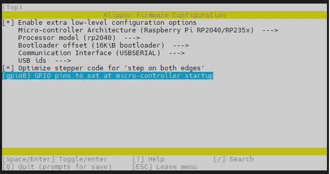 cd ~/klipper && rm -rf ~/klipper/.config && rm -rf ~/klipper/out && make menuconfig -