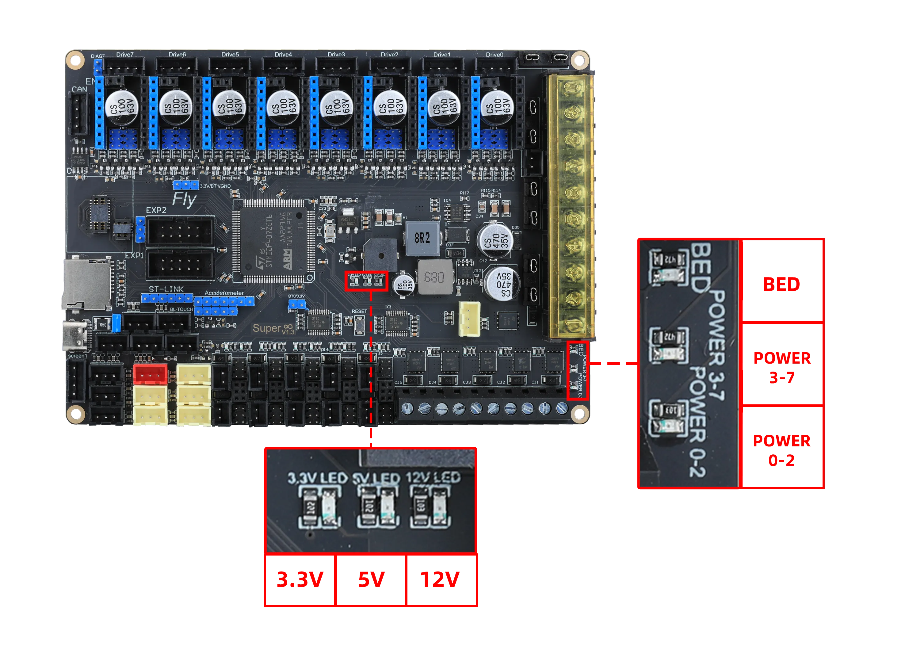 3.3V,5V, and12V. - The power indicator at the bottom left of the motherboard will only light up normally after connecting the driver power supplies 0-2, driver power supplies 3-7, and the heated bed power supply.