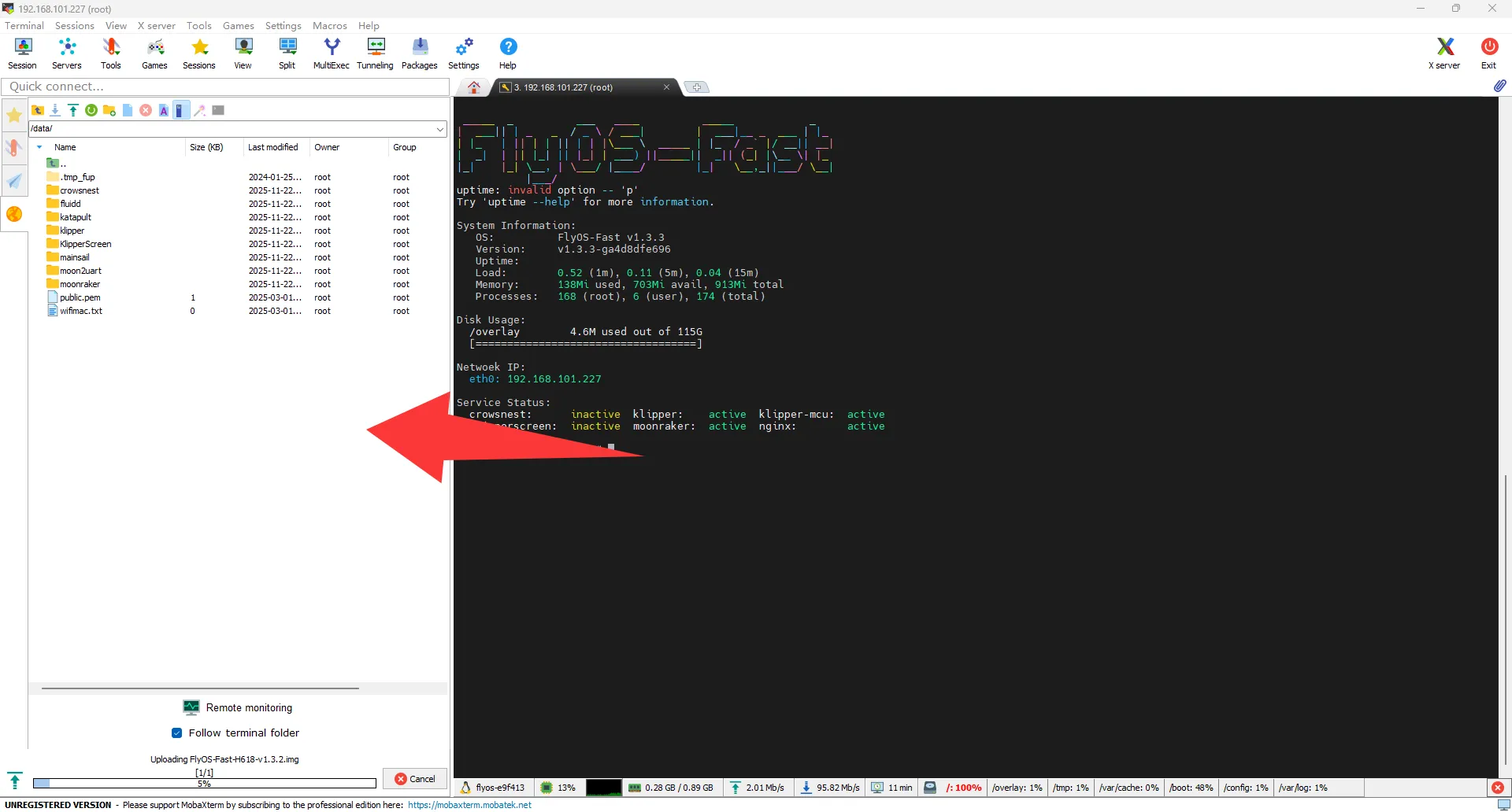 3. Faites glisser directement le fichier image préparé à l'étape 1 (par exemple FlyOS-Fast-H618-v1.3.2.img) vers le répertoire /data/ dans la zone de navigation de fichiers de MobaXterm, et attendez la fin du transfert.