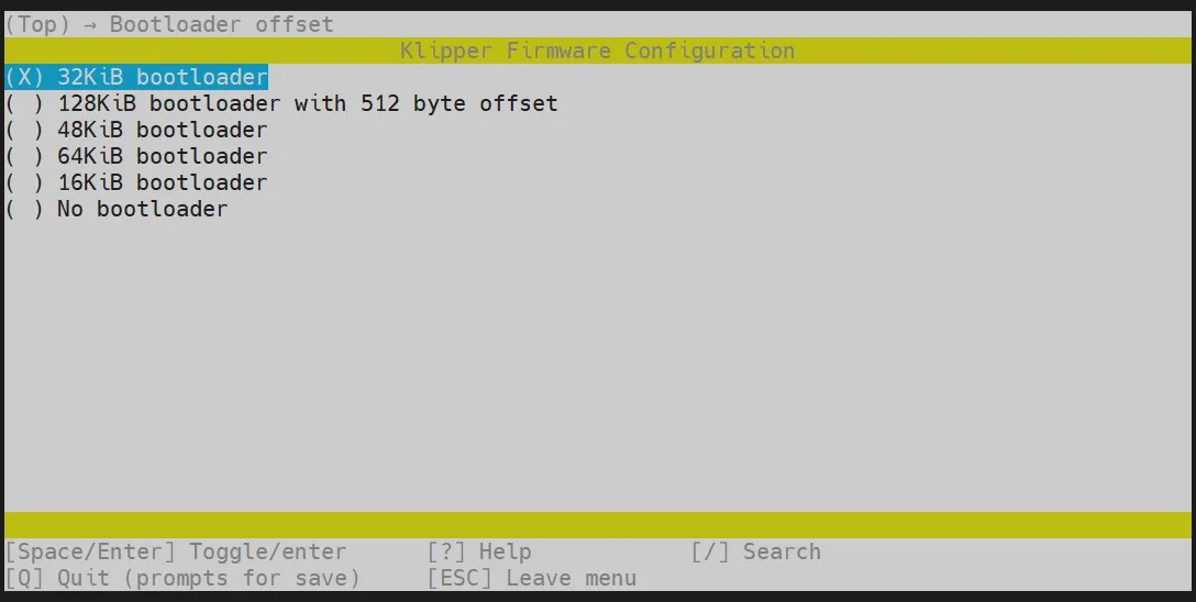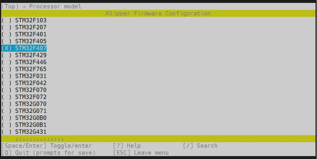 cd ~/klipper && rm -rf ~/klipper/.config && rm -rf ~/klipper/out && make menuconfig