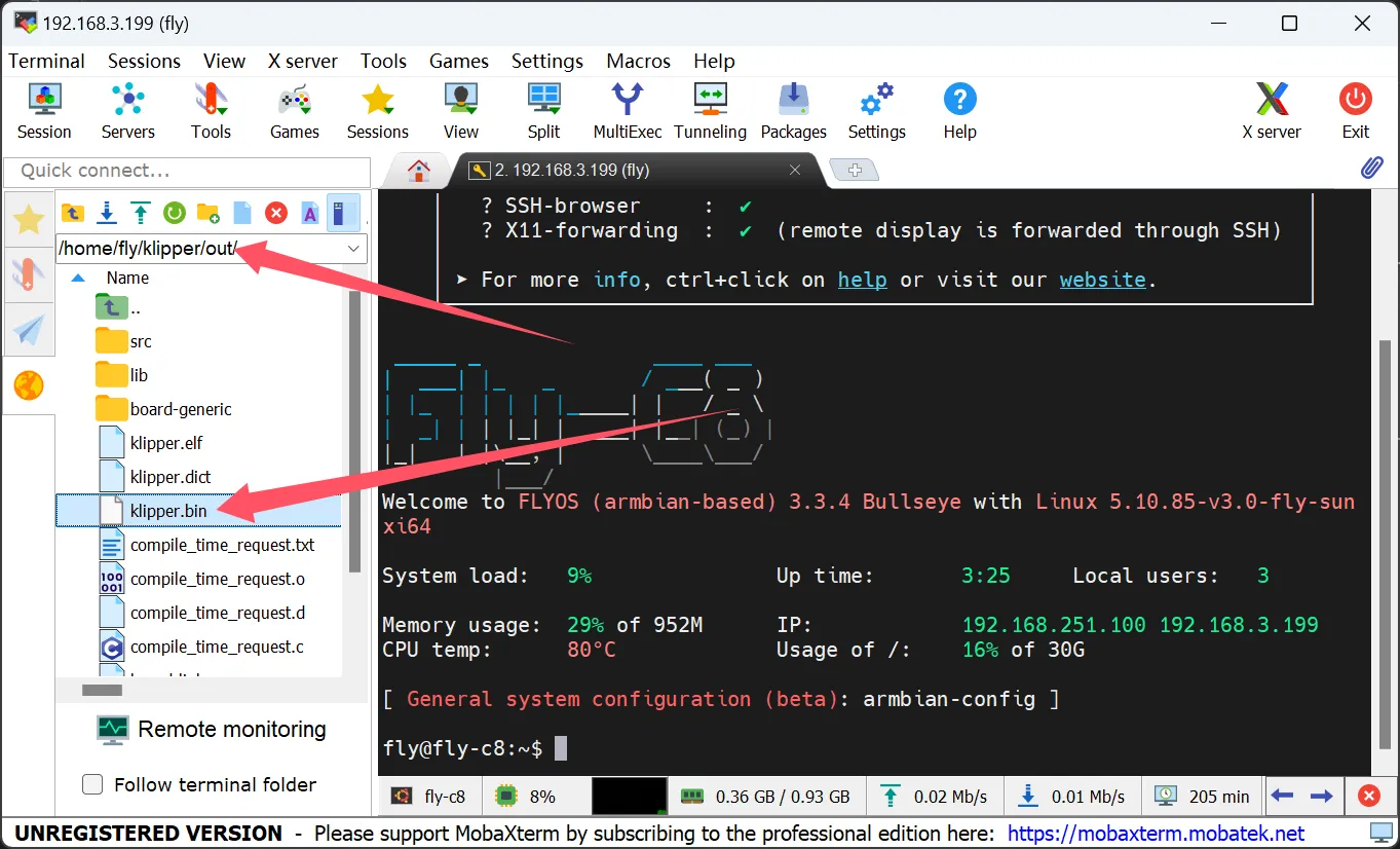 • Le firmware compilé se trouve dans le répertoire /home/<votre nom d'utilisateur sur l'ordinateur principal>/klipper/out/