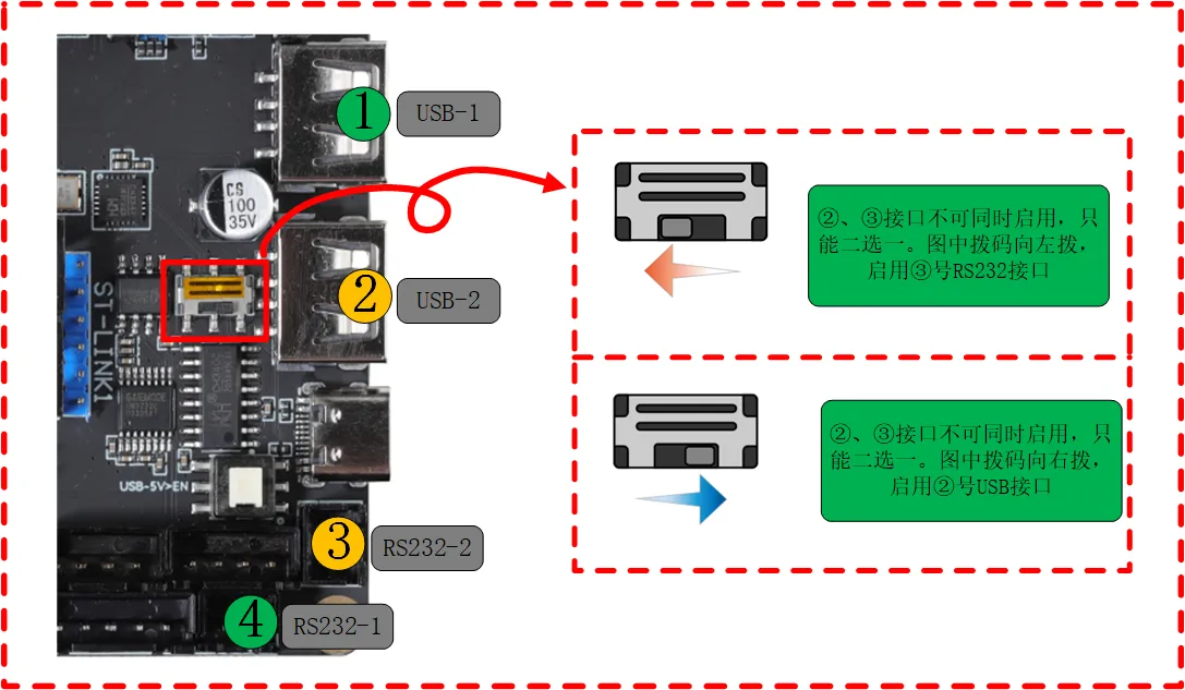 - Lorsque le commutateur est poussé vers la gauche, il active l'interface RS232 à côté du port Type-C.