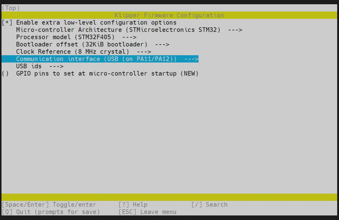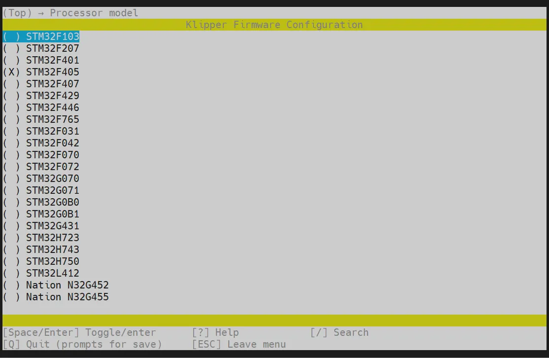 cd ~/klipper && rm -rf ~/klipper/.config && rm -rf ~/klipper/out && make menuconfig