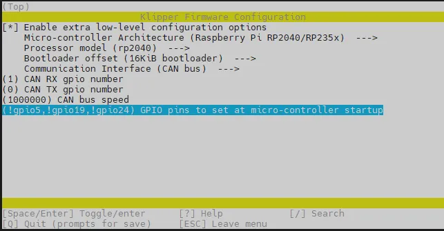 - Sélectionnez GPIO pins to set at micro-controller startup, saisissez : !gpio5,!gpio19,!gpio24