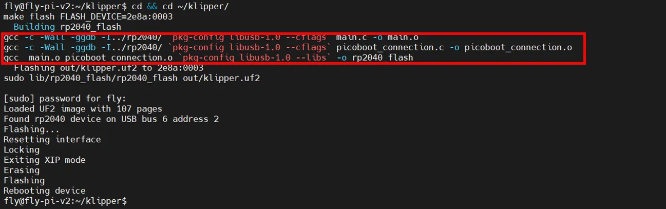 make flash FLASH_DEVICE=2e8a:0003promptSi c'est la première fois que vous gravez après avoir configuré le système à partir de l'ordinateur principal, vous pourriez voir un message similaire à celui entouré en rouge dans l'image ci-dessous - une partie des messages sera en rouge, ce qui est normal et n'est pas une erreur.