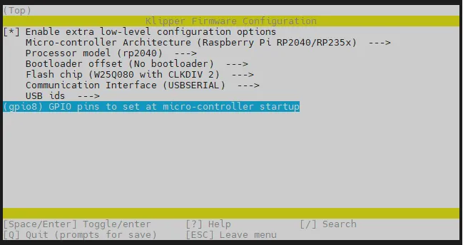 cd ~/klipper && rm -rf ~/klipper/.config && rm -rf ~/klipper/out && make menuconfig -