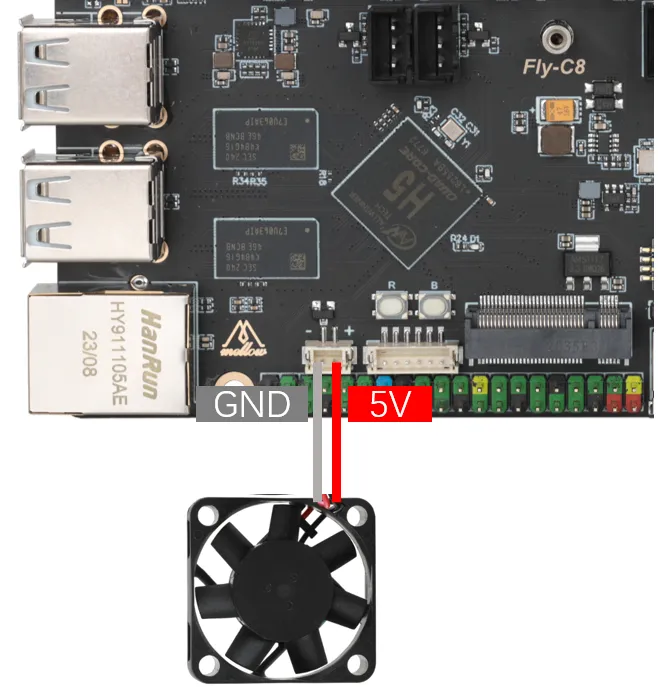 C8には5Vの制御可能な端子が搭載されており、メインボードの冷却に使用できます。配線方法は下図の通りです。