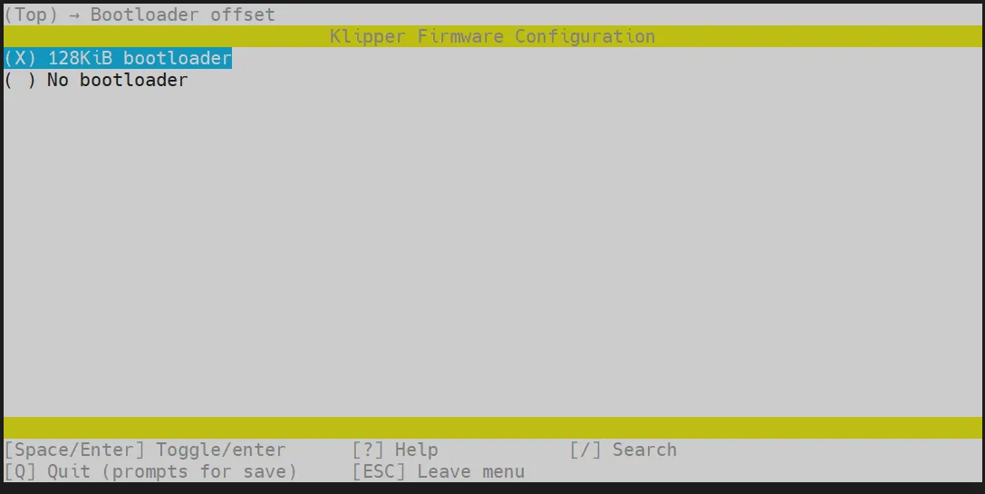 ESCは、一つ前のメニューに戻ります Qキーは、Klipperファームウェアの設定ページを終了しますYキーは、Klipperファームウェアの設定ページを終了する際に、プロンプトがある場合に、Yキーを押して設定ファイルを保存します