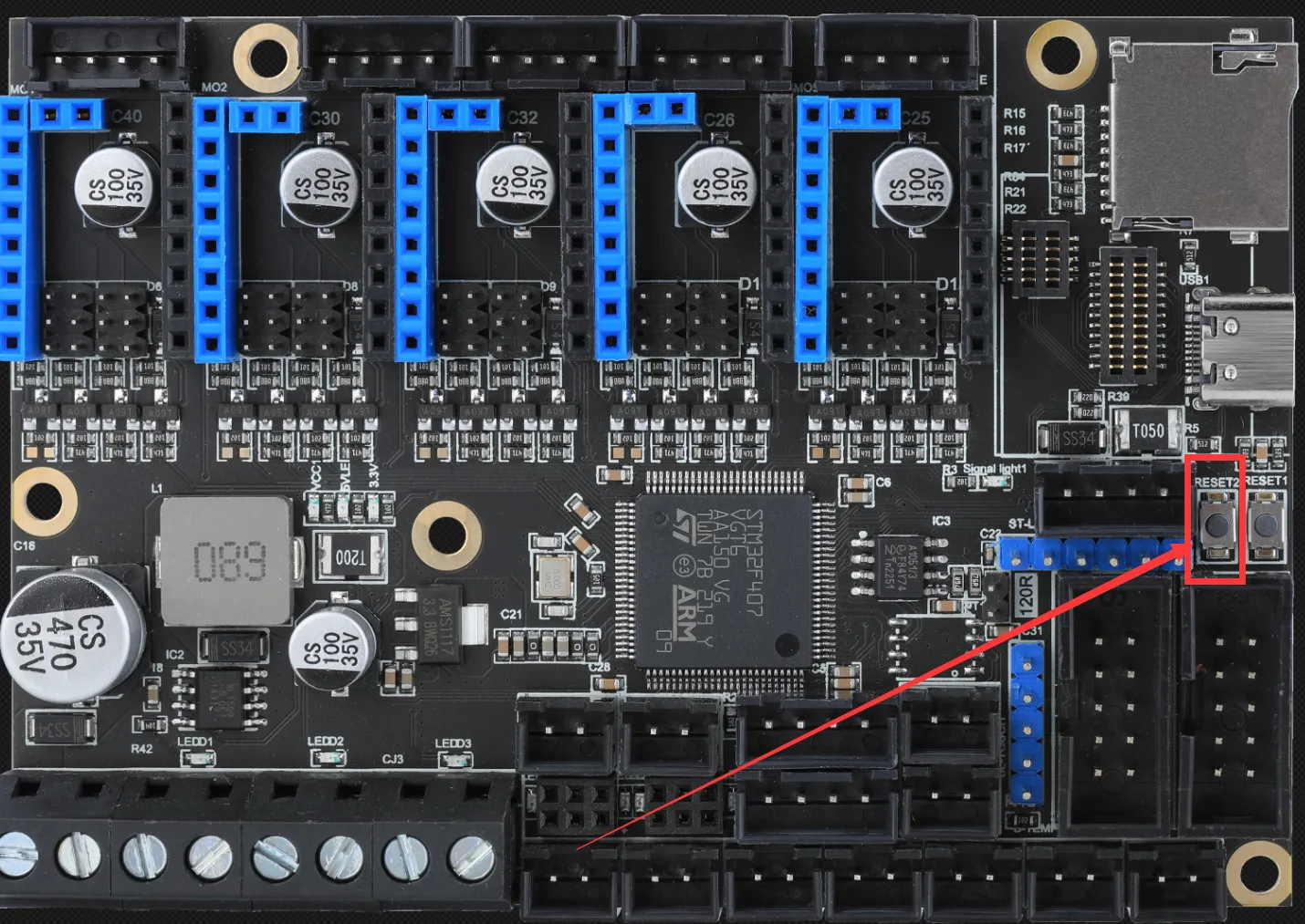 • 2番目:データ通信可能なTYPE-Cケーブルを一方はマザーボード、他方に自分のデバイスに接続した後、BOOTボタンを押しながらRSTボタンを押し、その後RSTボタンを離し、最後にBOOTボタンを離します