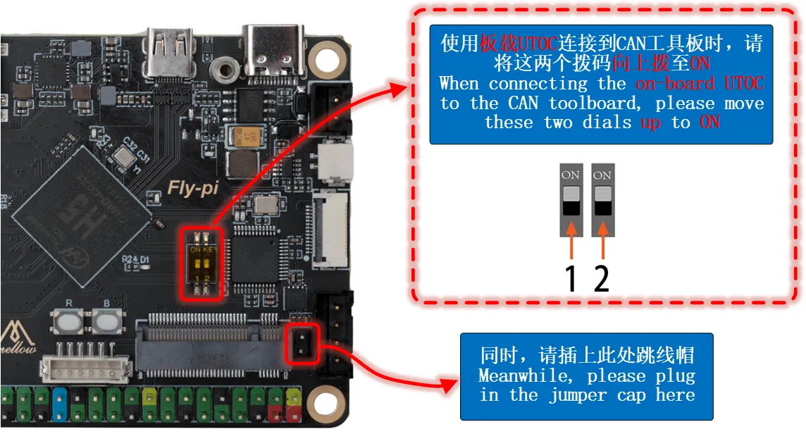 上位コンピュータクラスフライパイ-V2ボード内蔵UTOCの使用このページの見出しボード内蔵UTOCの使用 ダイヤルスイッチをオンにする ダイヤルスイッチをオンにすると、1つのUSBポートが使用されます ヒントダイヤルスイッチをオンにしてボード内蔵UTOCを有効にすると、以下の図に示すUSBポートが使用され、他のデバイスを接続することはできません!!! ケーブルの接続 Loading...