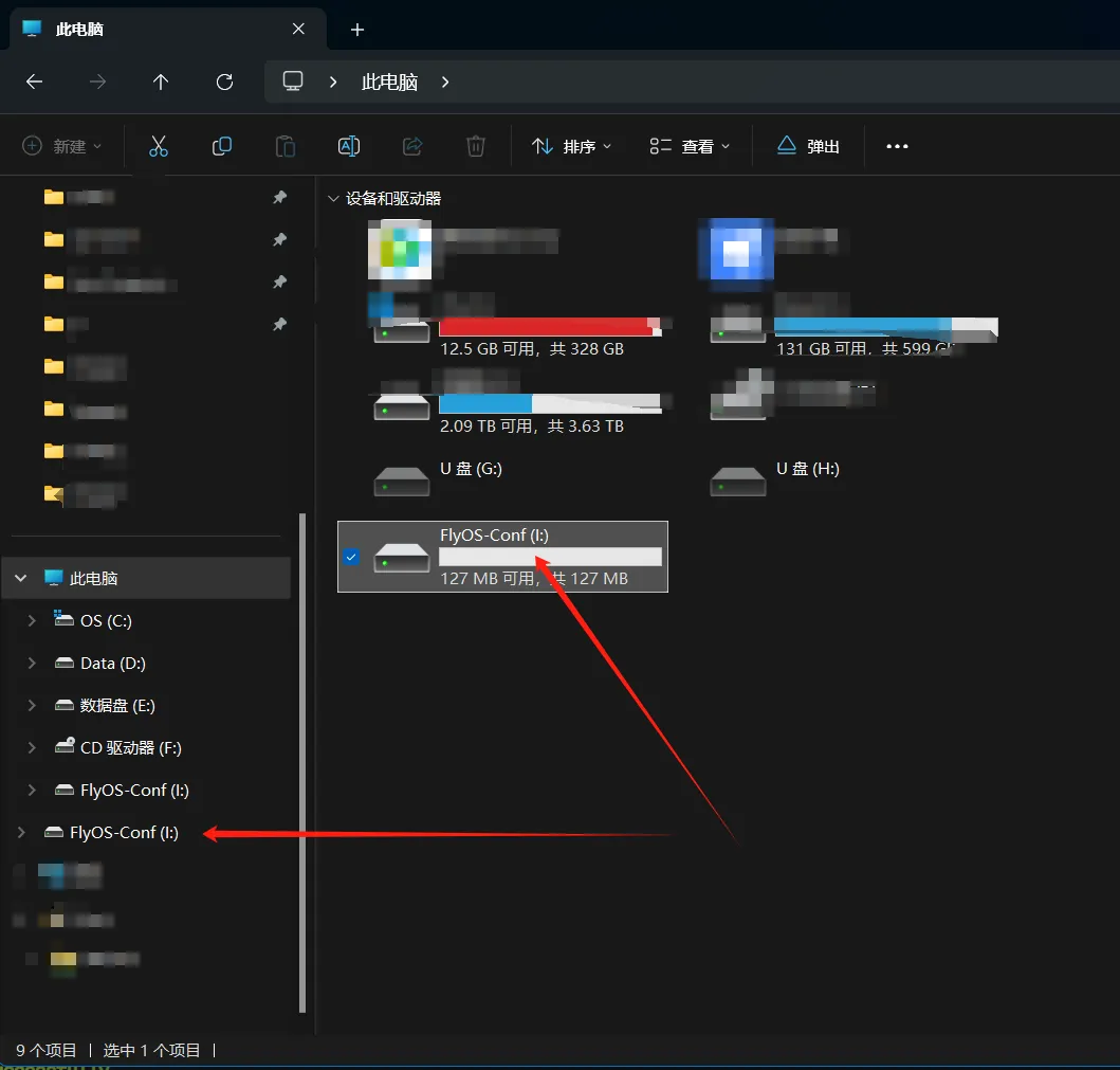 8. ファイルエクスプローラーを開き、FlyOS-Confという名前のUSBメモリまたはリムーバブルディスクが存在するか確認します