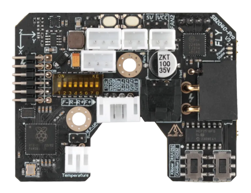 FLY SB2040 PRO V3は、広州マグネシウム電子科技有限公司がVORON Stealthburberプリントヘッド向けに開発したツールボードです。このツールボードを使用することで、従来のメインボードとプリントヘッド間の煩雑な配線を4本のワイヤーに置き換え、レイアウトを最適化できます。SB2040はstealthburnerとafterburnerに適用可能で、CANトランシーバ、RS232トランシーバ、USBポート、TMC2240ドライバ、LIS2DW加速度センサー、3つの制御可能なファンなどの機能を統合したツールボードです。このツールボードはKlipperおよびRRFファームウェアに対応しています。