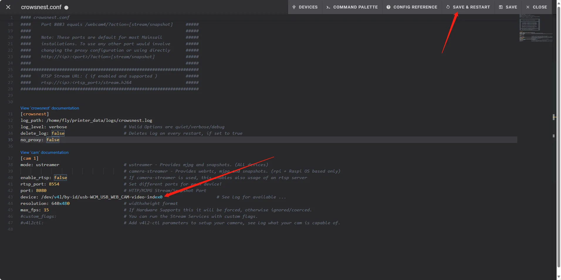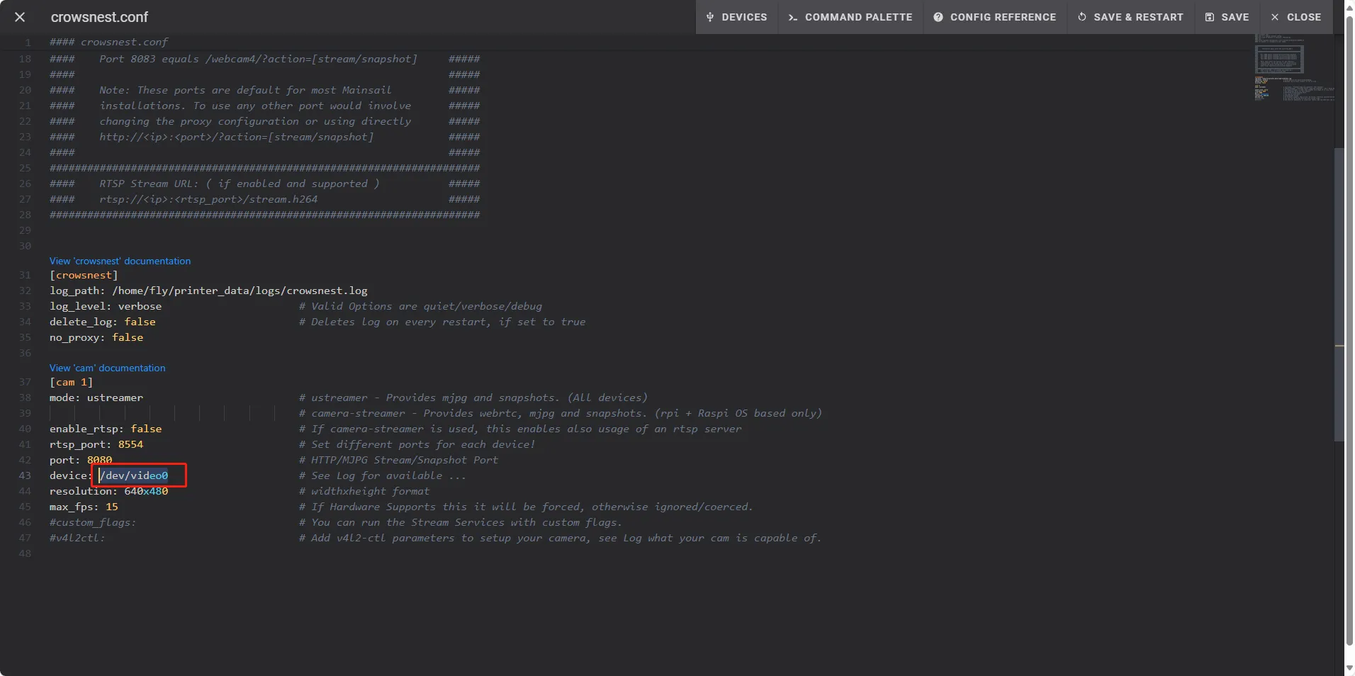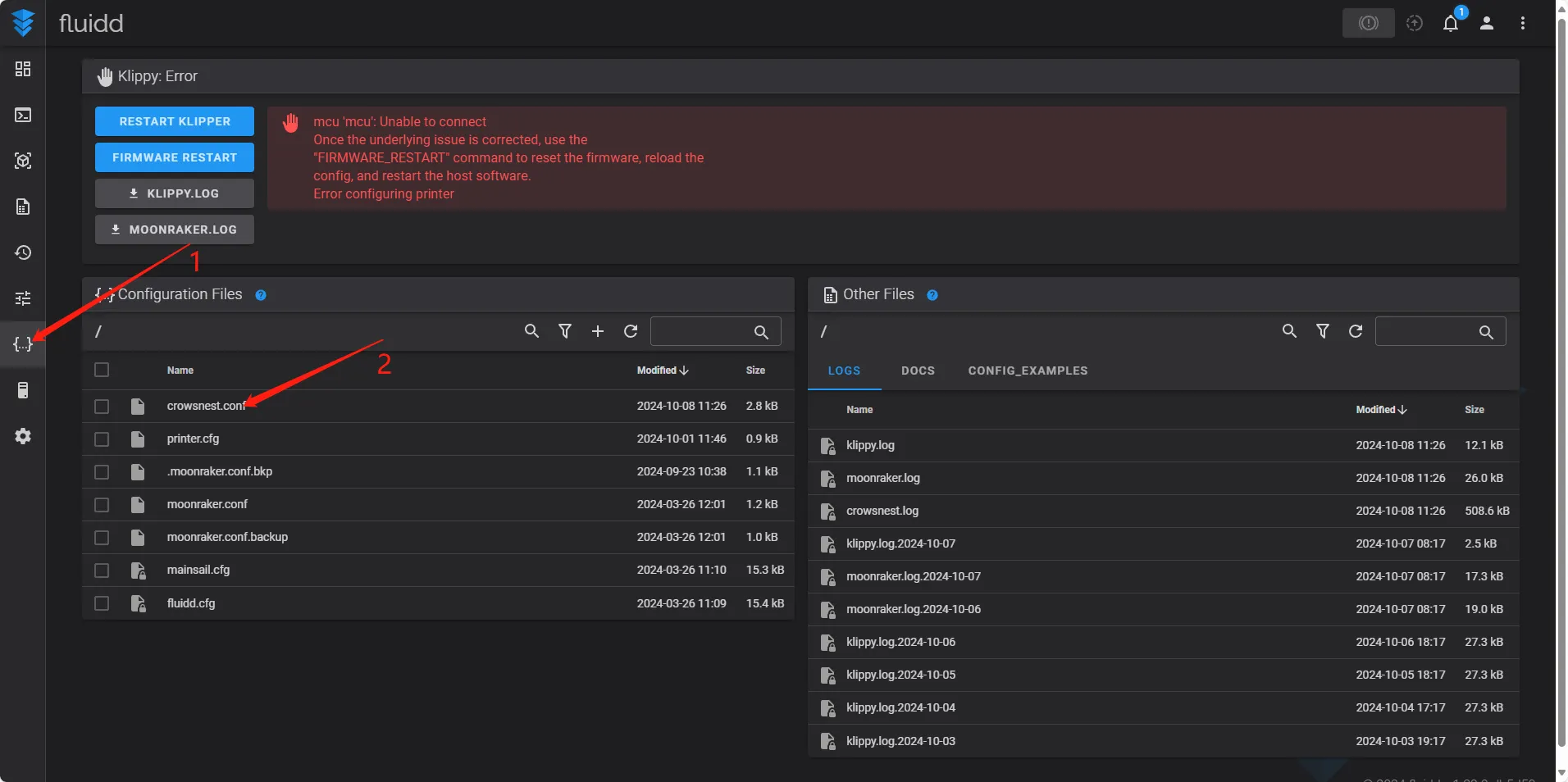 • Fluidd에서 설정 파일을 찾아 crowsnest.conf 파일 열기
