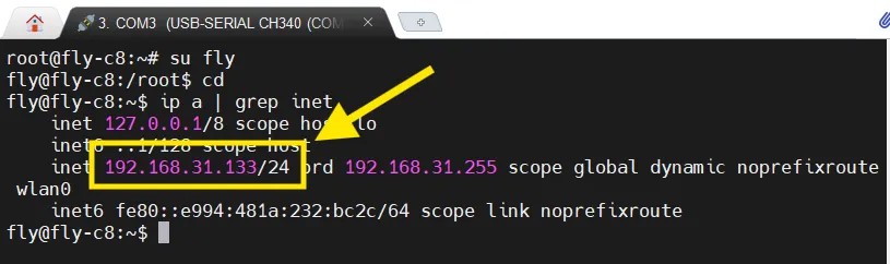 IP주소를 확인하려면 유선 또는 WIFI에 연결되어 있어야 합니다. WIFI 연결 - IP 주소를 확인하려면 SSH에서 다음 명령을 입력하고 엔터를 누른 후, 라우터와 동일한 서브넷에 있는 IP 주소를 찾으면 됩니다.