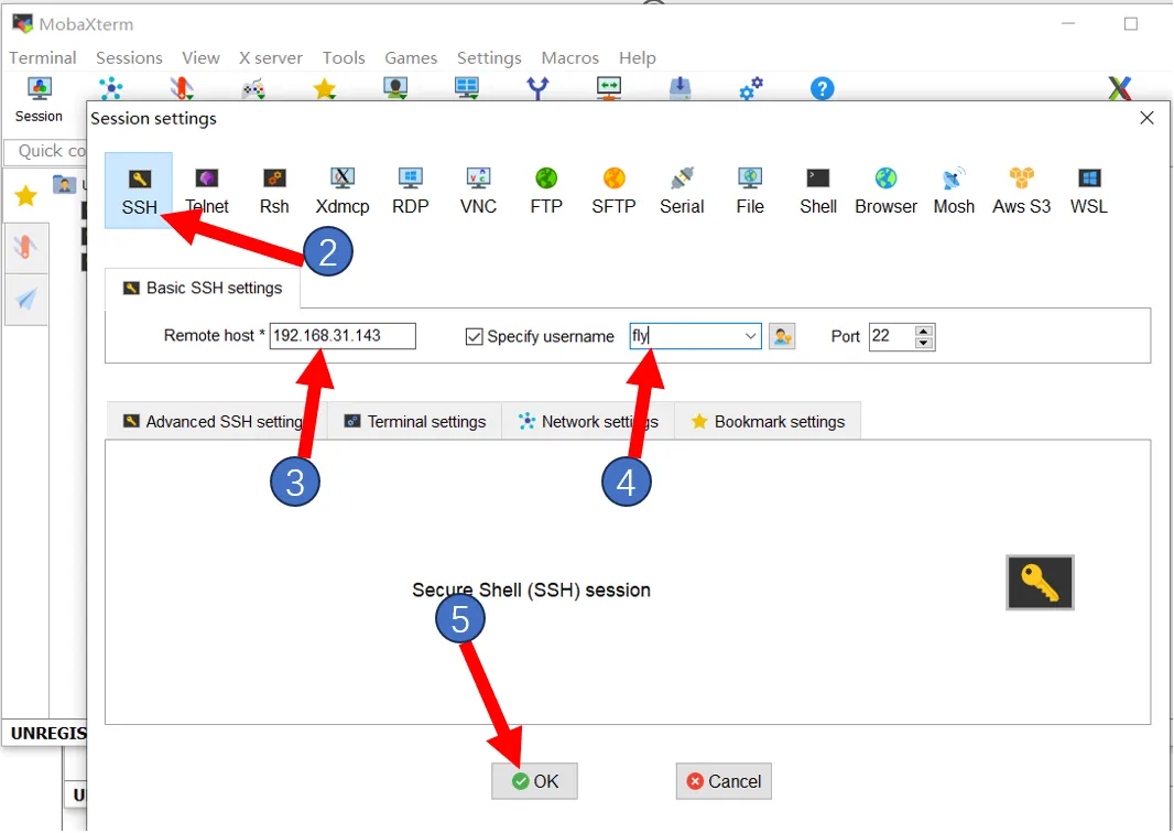 - MobaXterm을 열고 다음과 같이 설정합니다. IP 주소는 이전에 확인한 IP를 입력하거나 라우터 관리자 페이지에서 확인할 수 있습니다.