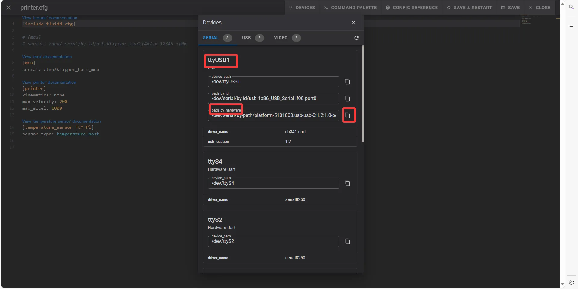 • fluidd에서 ttyUSB가 존재하는지 확인하고 Path_by_hardware도 존재해야 함, 이것이 RS232_ID임