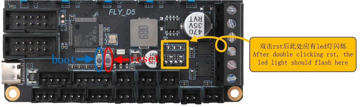 • Type-C 케이블로 메인보드를 호스트 컴퓨터에 연결한 후, 리셋 버튼을 두 번 누릅니다. 그러면 메인보드의 LED가 깜빡입니다.