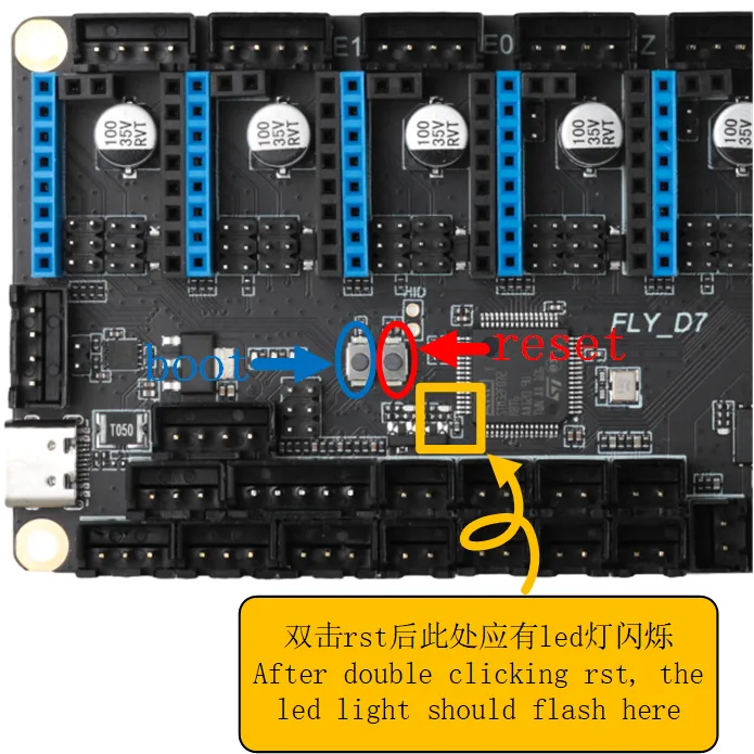 • Type-C 케이블로 메인보드를 호스트 컴퓨터에 연결한 후, 리셋 버튼을 두 번 누릅니다. 그러면 메인보드의 LED가 깜빡입니다.