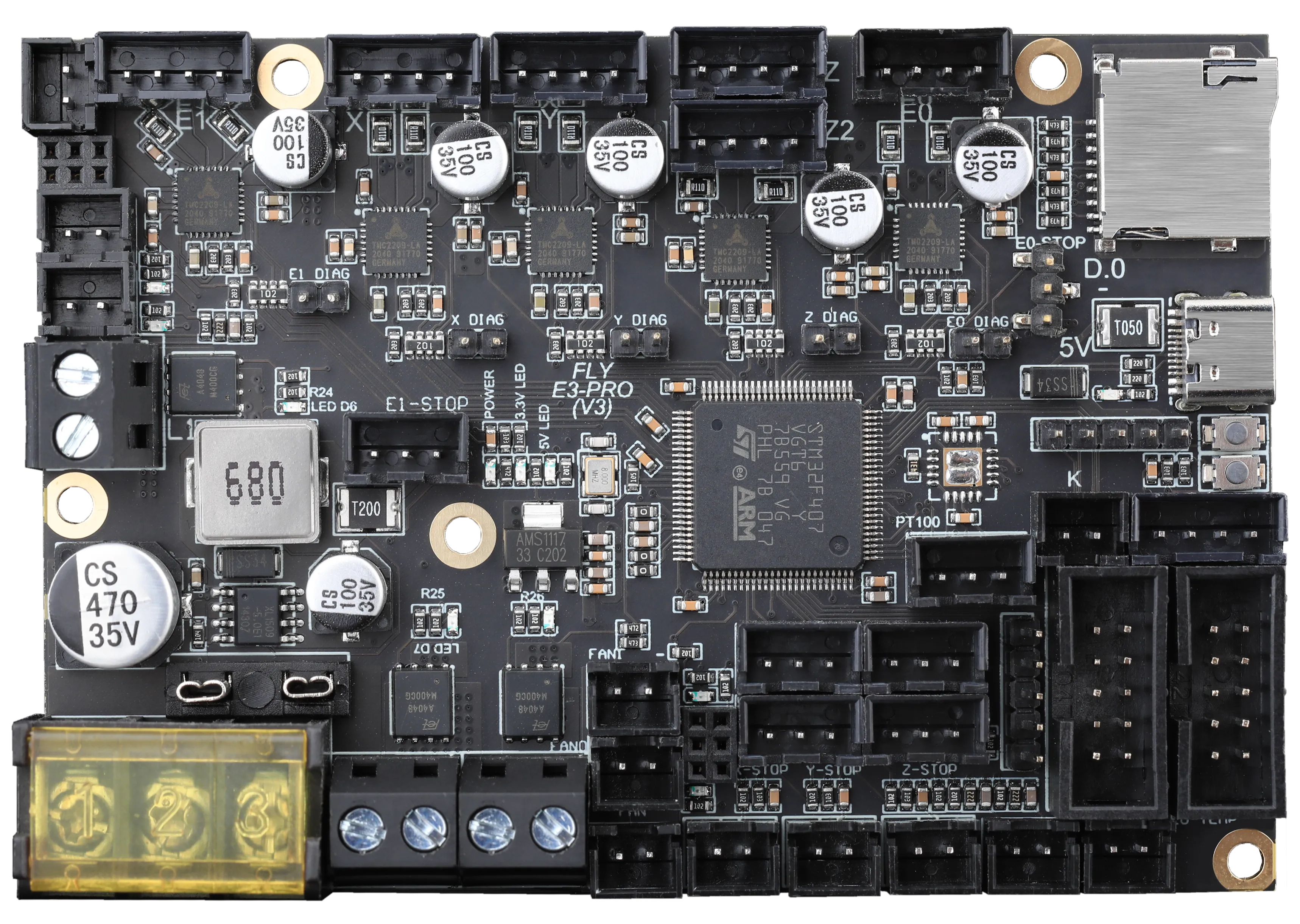 - 고전압 IN 포트 1개, 자동 레벨 센서 지원: BLTouch, PL08N 등 근접 센서, Klicky, Voron Tap 등