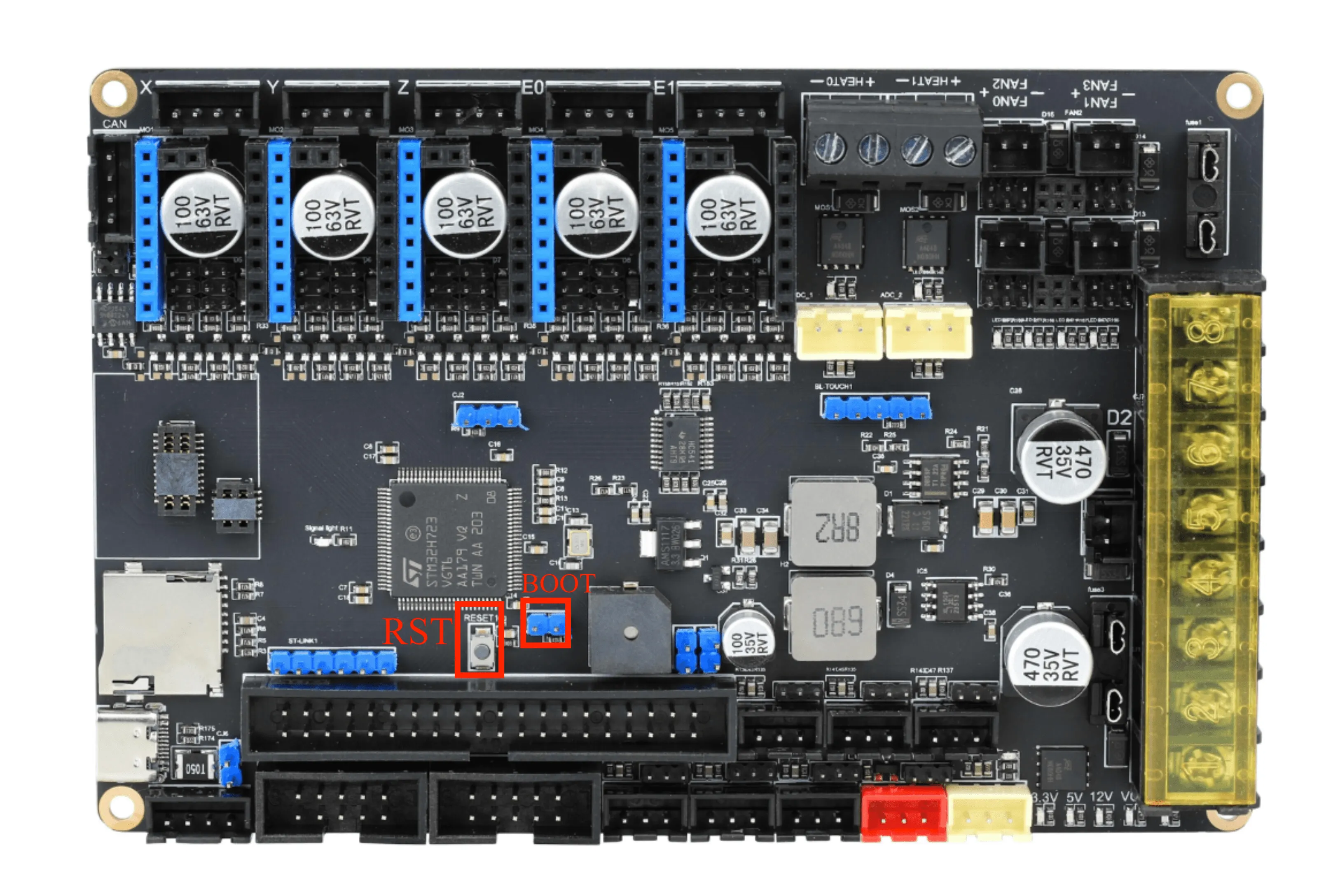 • 두 번째: 데이터 전송이 가능한 TYPE-C 케이블을 한쪽은 메인보드에, 다른 쪽은 장치에 연결한 후 BOOT 버튼을 누른 상태에서 RST 버튼을 누르고, RST 버튼을 먼저 떼고 BOOT 버튼을 뗍니다.