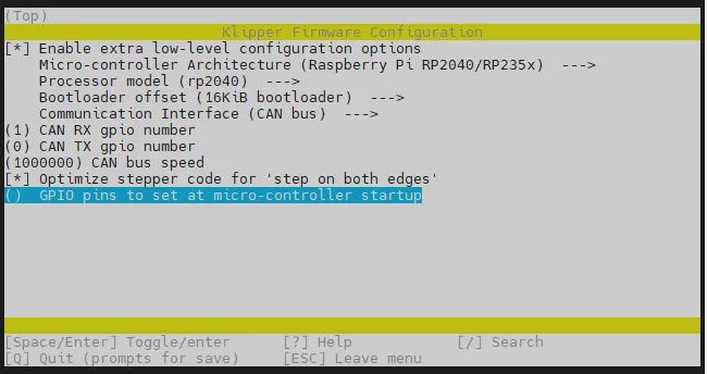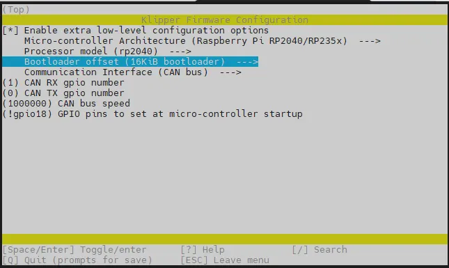 ESC는 상위 메뉴로 돌아갑니다. Q키는 Klipper 펌웨어 구성 페이지를 종료합니다.- Klipper 펌웨어 구성 페이지를 종료할 때