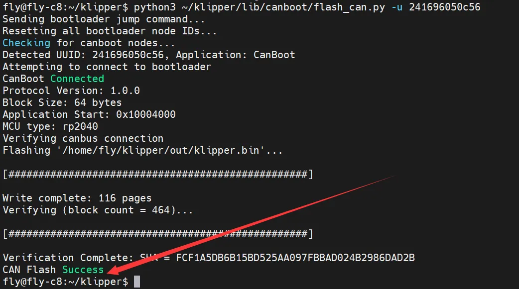 241696050c56을 검색한 UUID로 교체하십시오.-u뒤에 공백이 있음을 주의하십시오.python3 ~/klipper/lib/canboot/flash_can.py -u 241696050c56 -
