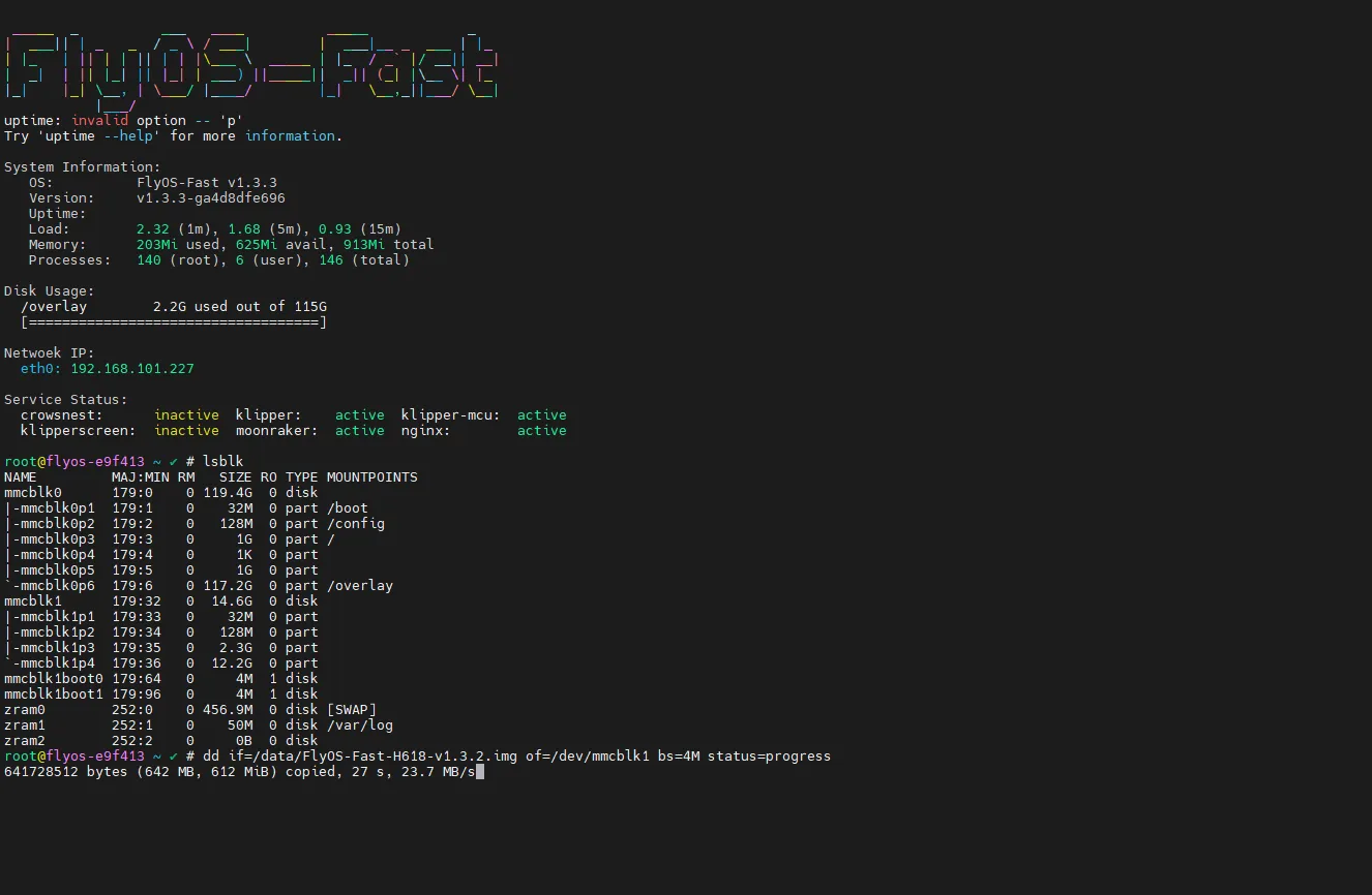 dd if=/data/FlyOS-Fast-H618-v1.3.2.img of=/dev/mmcblk1 bs=4M status=progress