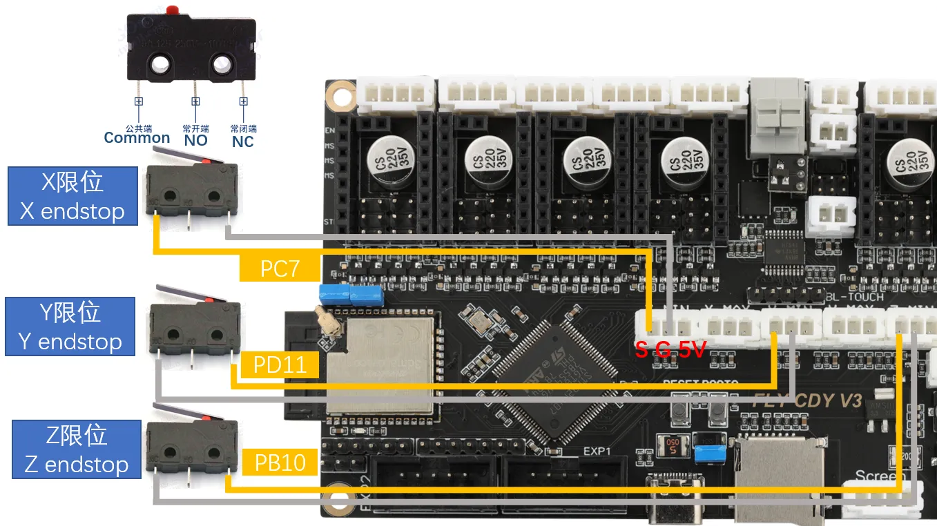 Klicky — это сторонний датчик выравнивания стола, который можно изготовить самостоятельно с очень низкой себестоимостью. Он стабилен в работе, обладает высокой стоимостью и рекомендуется к использованию. Способ подключения показан на рисунке ниже.
