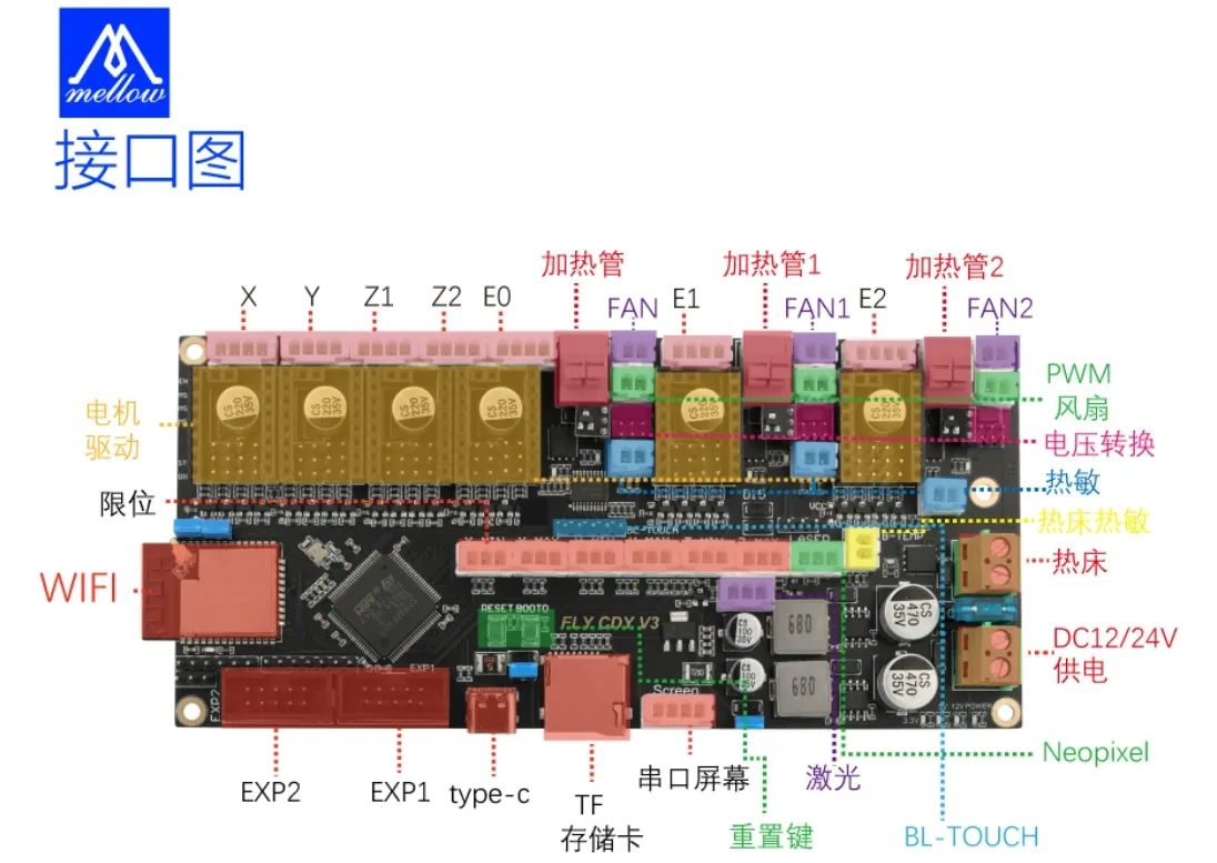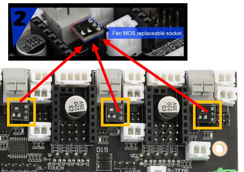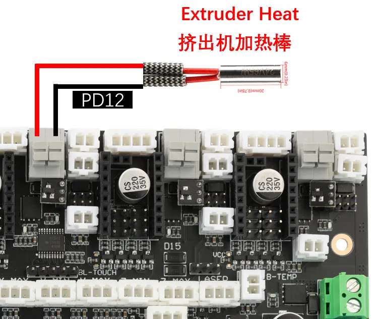 Хотбед на постоянном токе (DC): При использовании встроенного MOSFET для подключения хотбеда постоянного тока обратите внимание на мощность. Максимальный ток для хотбеда постоянного тока не должен превышать 10А. Если ток превышает 10А, рекомендуется использовать внешний MOSFET-модуль для управления хотбедом, иначе можно нанести необратимый ущерб материнской плате.