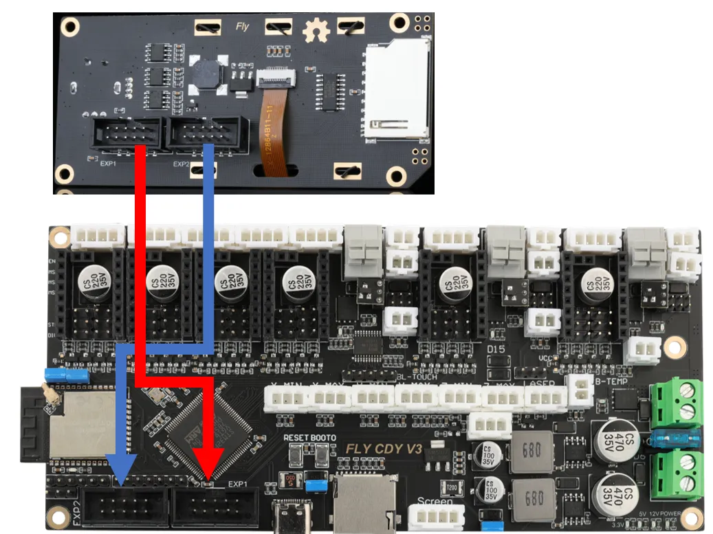 Ниже показан способ подключения экрана FLY mini12864. Для экранов других производителей обращайтесь к соответствующему производителю. Неправильное подключение экрана mini12864 (перепутанные провода) может привести к невозможности подключения хоста к MCU. Если до использования экрана mini12864 можно было нормально подключиться к MCU материнской платы, а после использования — нет, попробуйте отключить кабель mini12864!!!