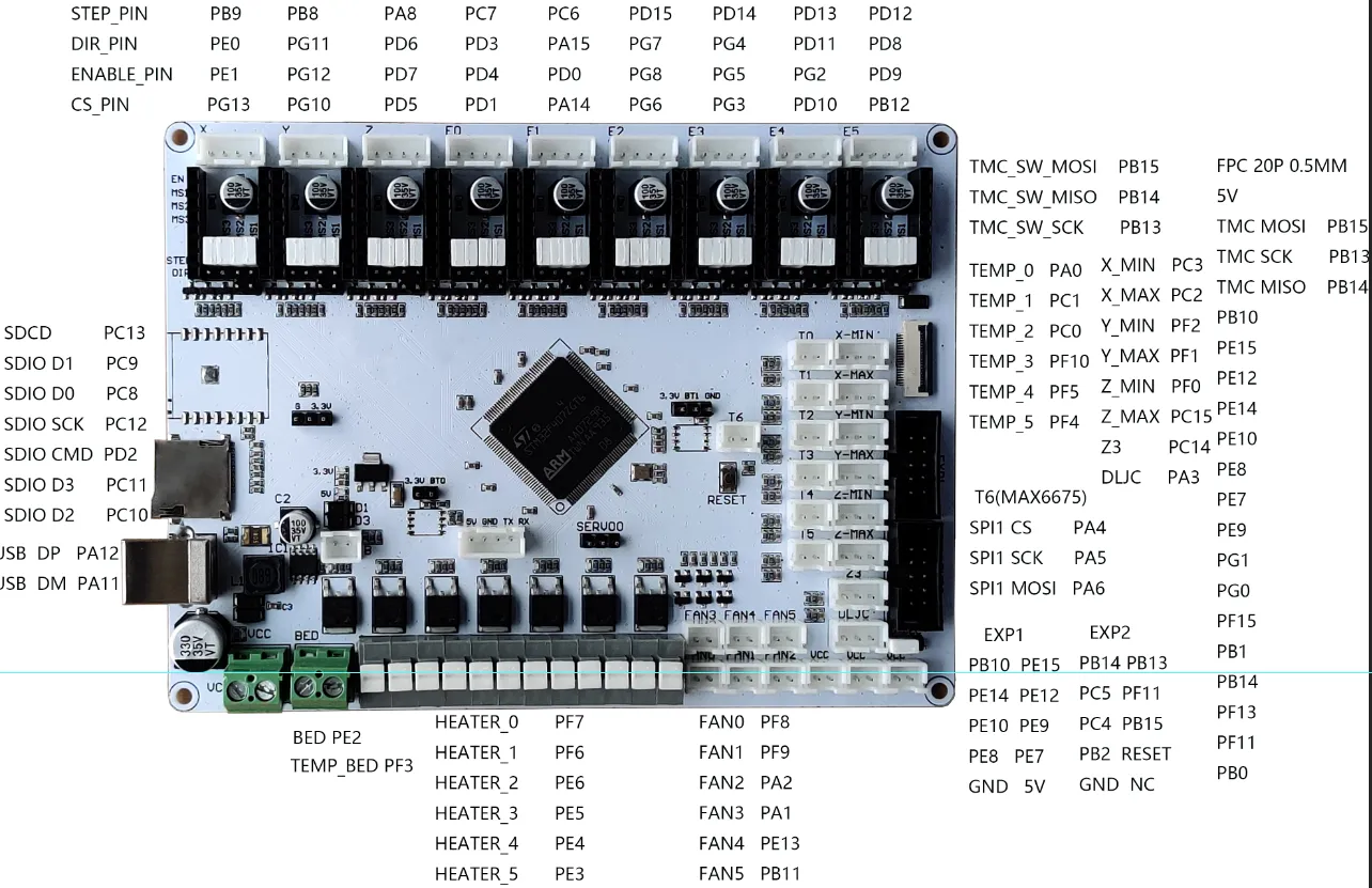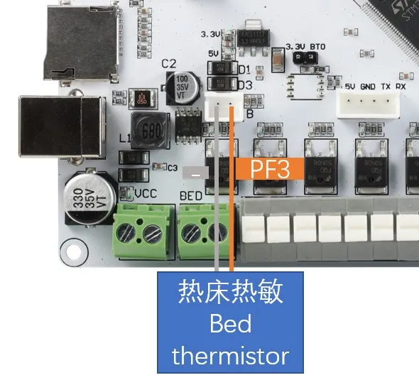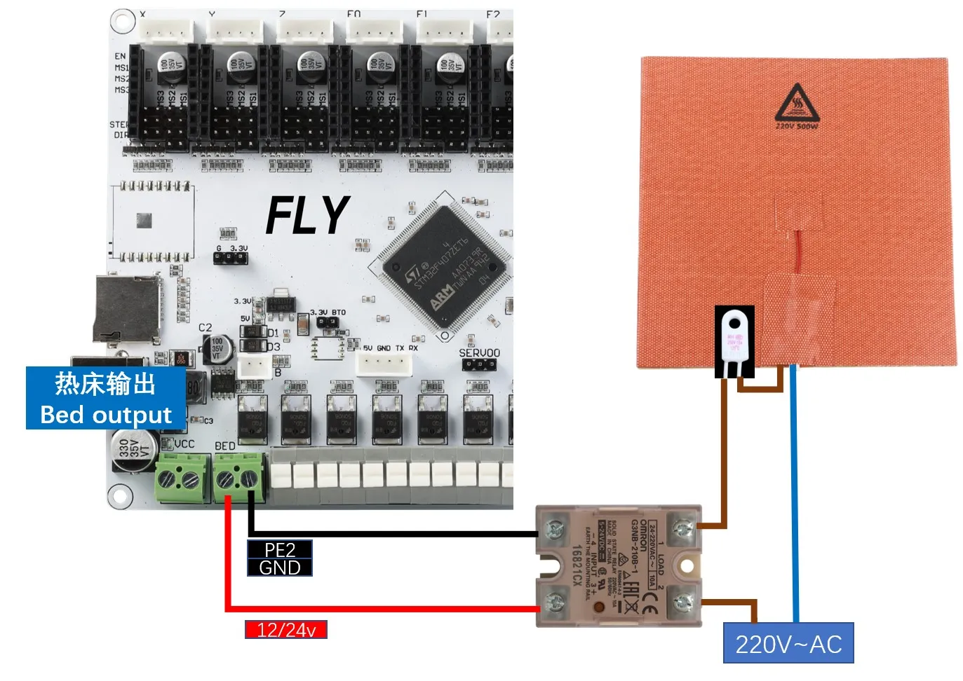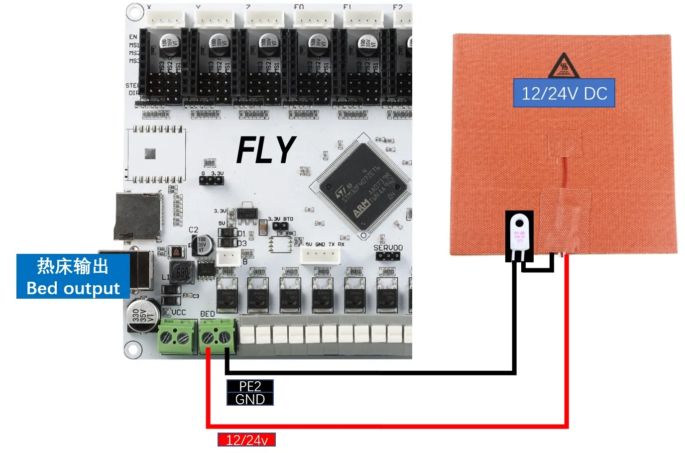 • Нагреваемый стол постоянного тока (DC): При подключении к MOSFET на плате постоянного нагреваемого стола обратите внимание на мощность. Максимальный ток постоянного нагреваемого стола не должен превышать 10А. Если ток превышает 10А, рекомендуется использовать внешний модуль MOSFET для подключения нагреваемого стола, иначе это может привести к необратимому повреждению материнской платы.