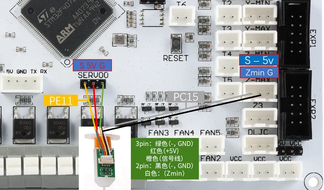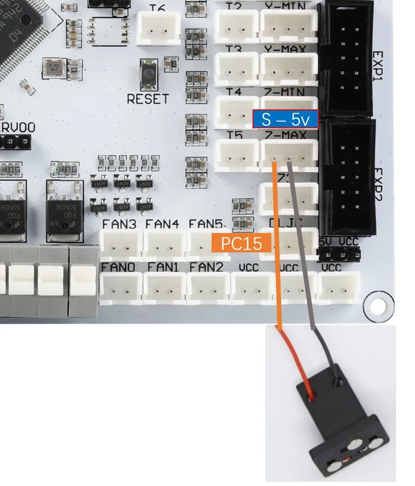 • Klicky — это сторонний датчик выравнивания стола, который можно легко изготовить дома за небольшие деньги. Он обладает стабильной производительностью и высокой стоимостью/эффективностью, рекомендуется к использованию. Схема подключения показана на рисунке ниже.