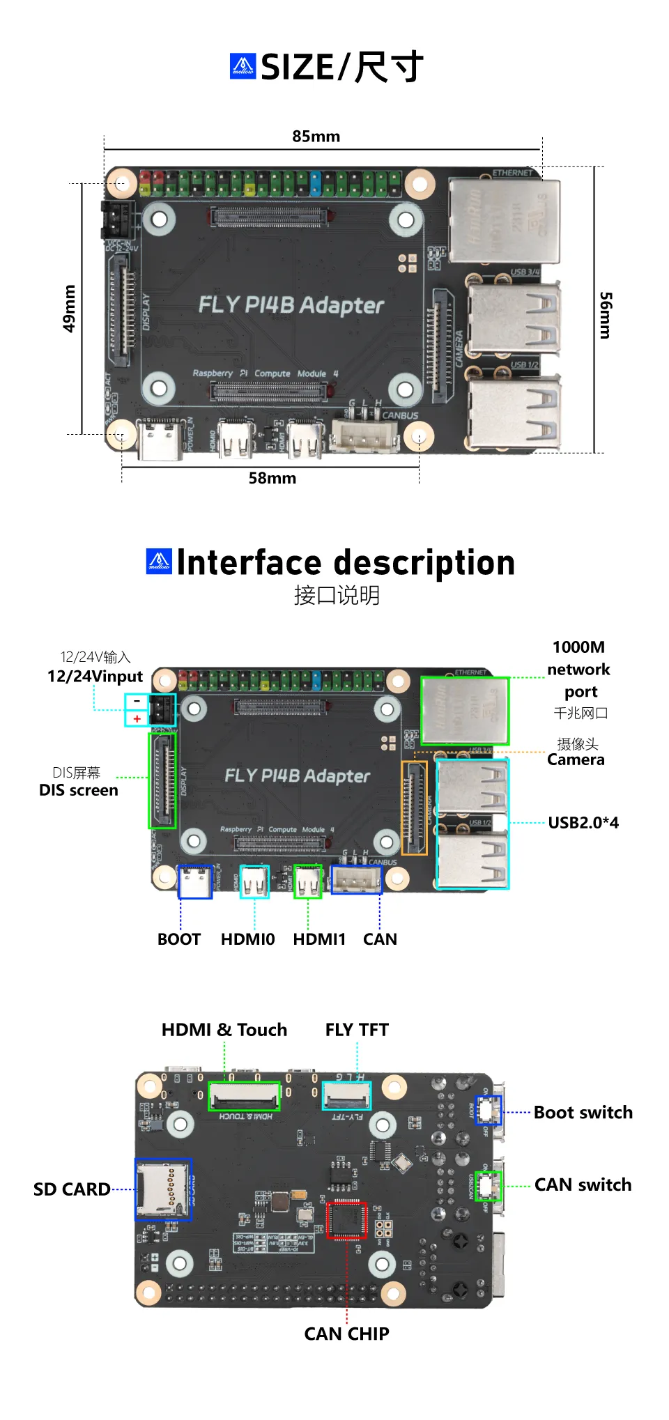 Fly-CM4 полностью совместим с Raspberry Pi 3B и 4B, и специально доработан для Raspberry Pi CM4. Эта плата расширения предоставляет полный набор функций, оптимизированных для 3D-принтеров. Питание постоянного тока 12-24В обеспечивает стабильность питания, что критически важно для точного управления 3D-принтером и его непрерывной работы. Поддержка FPC-кабеля для экранов FLY-TFT и Fly-HDMI обеспечивает более удобную прокладку проводов. Наличие CAN-порта позволяет напрямую подключать верхний компьютер к нижнему по CAN-шине, что является в настоящее время популярным способом.